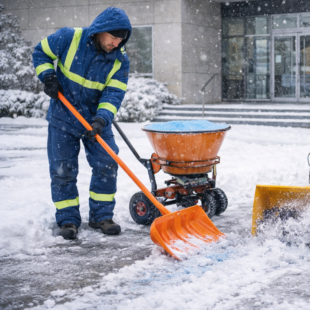 Einsatz von Streumitteln wie Splitt oder Salz, abhängig von Witterung und örtlichen Vorgaben. Ziel: Reduzierung von Glätte, Sicherstellung rutschfester Flächen und Vorbeugung erneuter Eisbildung.