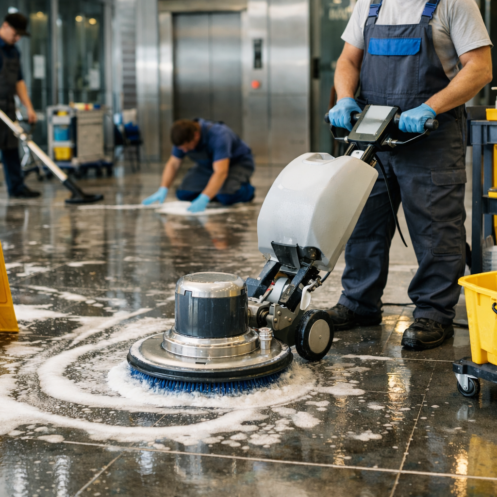 Einsatz spezieller Reinigungsgeräte und -mittel, um tief sitzende Schmutzschichten zu lösen. Besonders relevant in Eingangsbereichen, Küchen, Sanitärzonen und stark frequentierten Flächen.